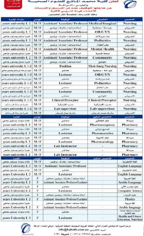 تعلن كلية محمد المانع للعلوم الضحية عن وظائف للجنسين بالخبر واتس نيوز